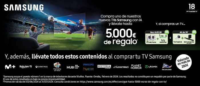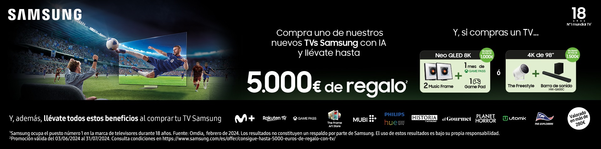 Registra tu compra de una televisión Samsung y recibe hasta 5000€ de cashback y una gran variedad de regalos, por parte de Samsung. Disfruta del deporte, tus series y películas favoritas o, incluso, de tus sesiones de videojuegos en 4k. Aprovéchate hoy.
