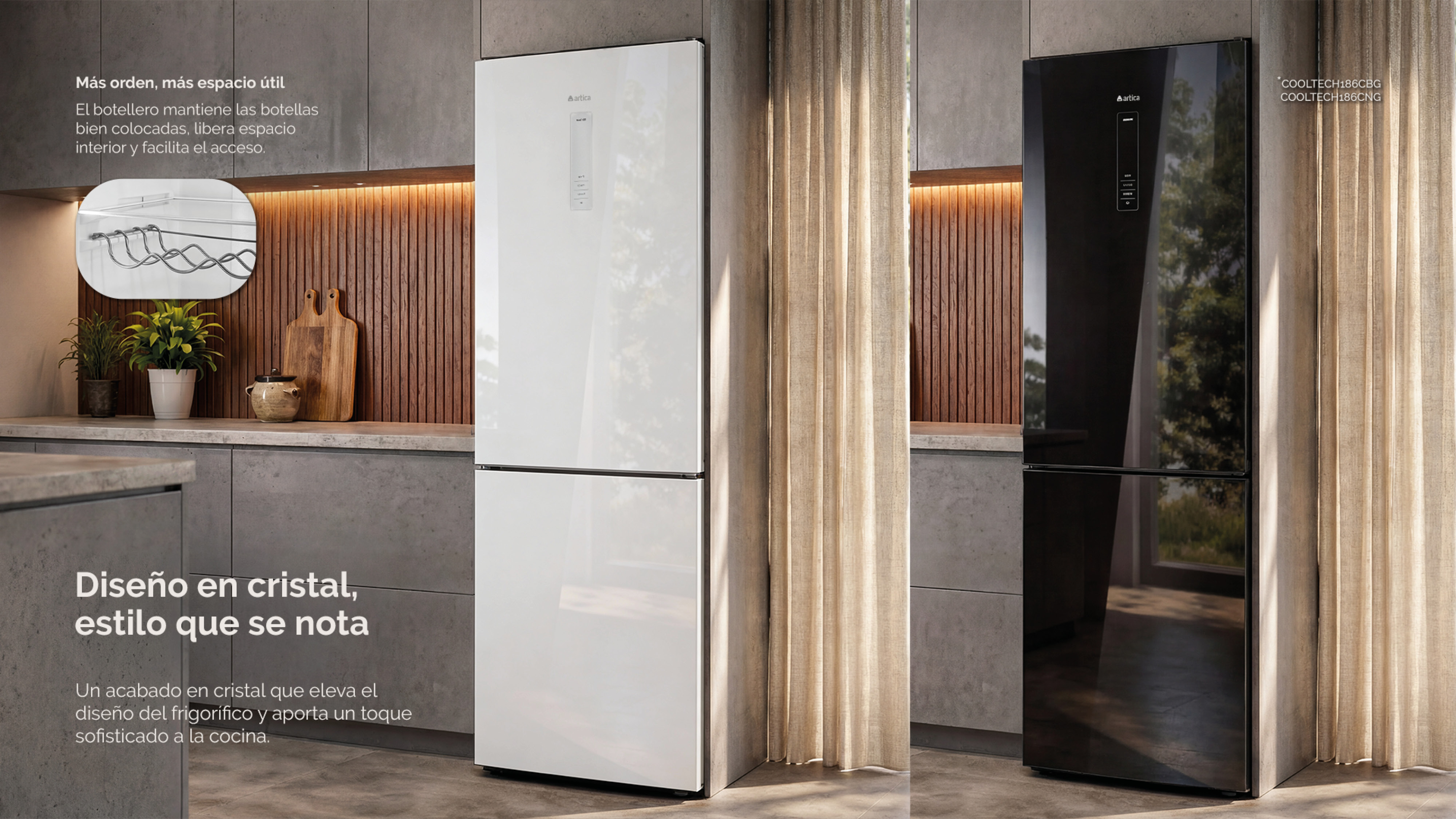 icono mielectro ficha productoFrigorífico Combi Artica COOLTECH186CBG - 186 x 60 cm, 322L, No Frost, Cristal blanco, Botellero