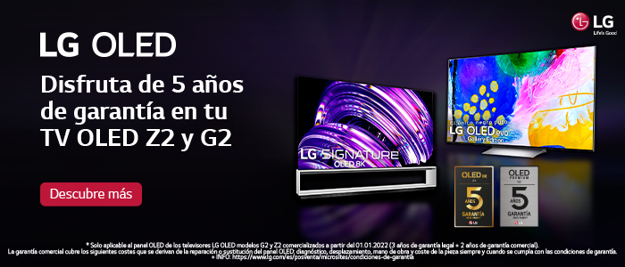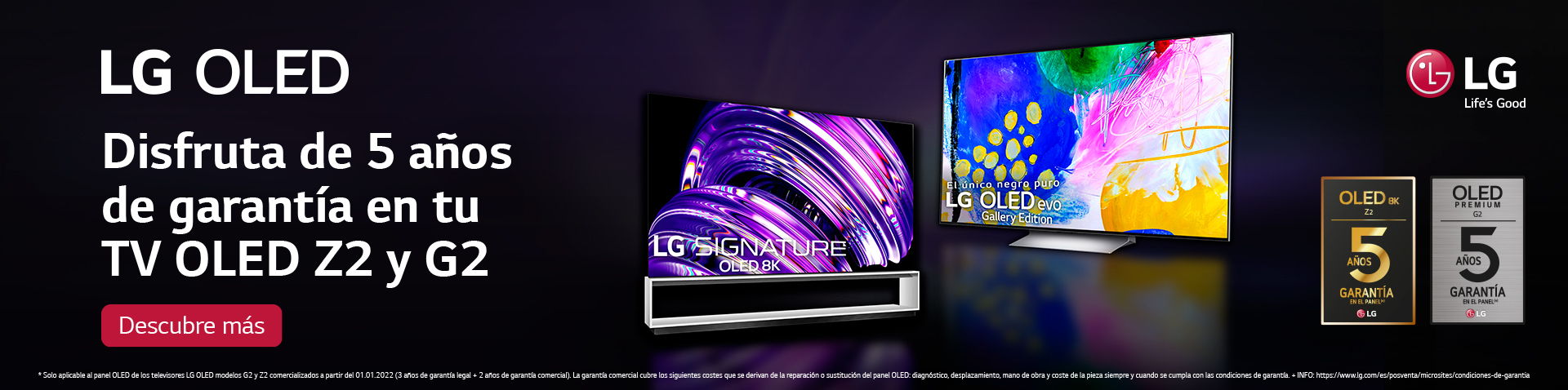 Disfruta de 5 años de garantía en tu TV OLED Series Z2 y G2. Se trata de 3 años de garantía legal a la que se añaden 2 años de garantía comercial que cubre los costes de reparación o sustitución del panel OLED, diagnóstico, desplazamiento, mano de obra y coste de la pieza siempre y cuando cumpla las condiciones de dicha garantía. Vigente desde: 01/01/2022