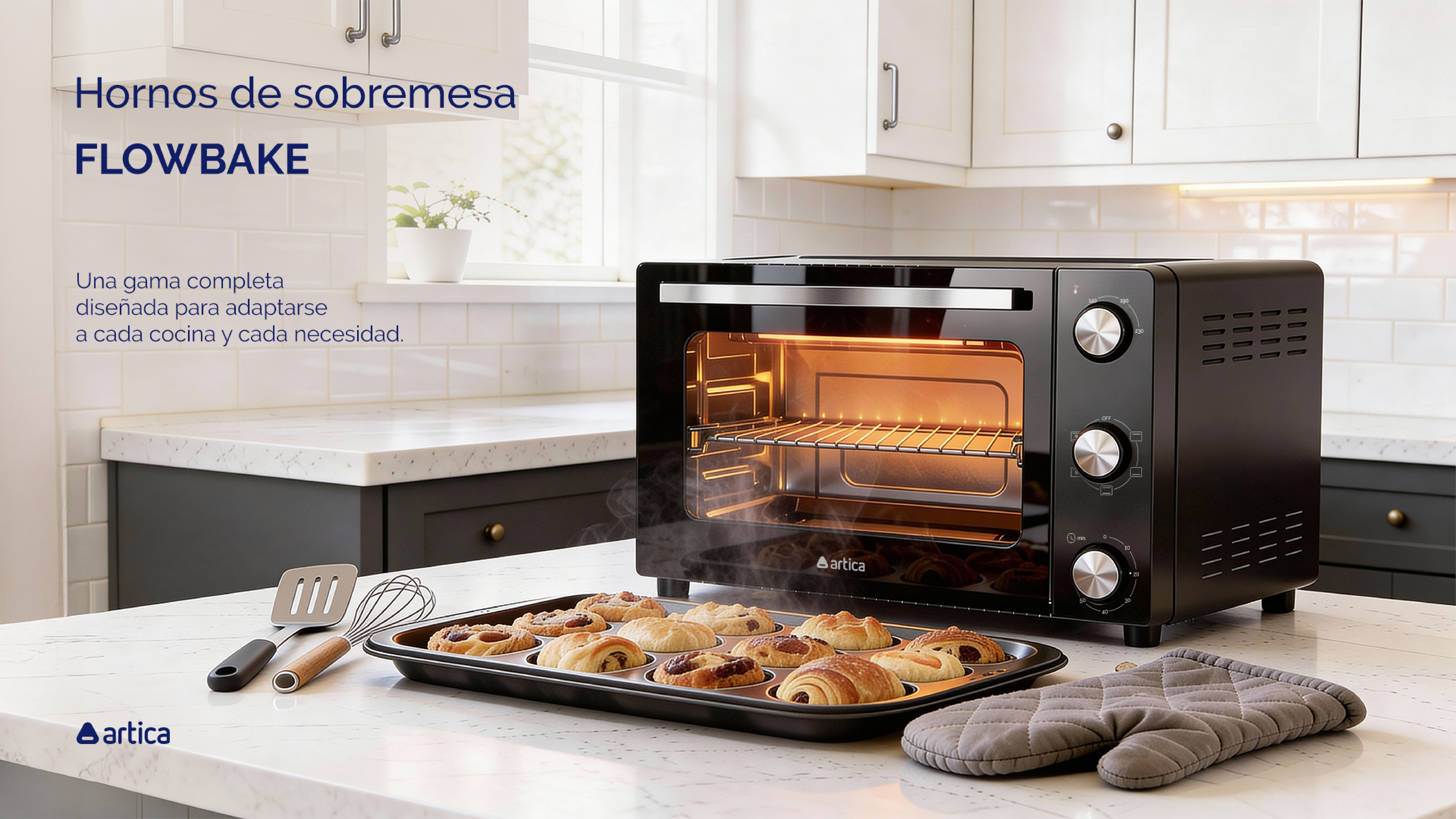 El FLOWBAKE 30 incorpora 30 litros de capacidad y función de convección, ideal para quienes buscan una cocción más uniforme y eficiente. El aire caliente se distribuye de forma homogénea, mejorando los resultados en repostería, asados y platos gratinados.
