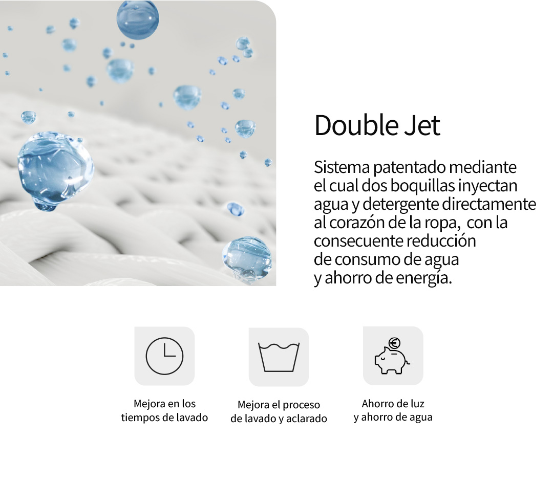 Double Jet: Sistema patentado mediante el cual dos boquillas inyectan agua y detergente directamente al corazón de la ropa, con la consecuente reducción de consumo de agua y ahorro de energía.