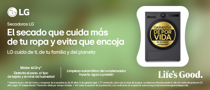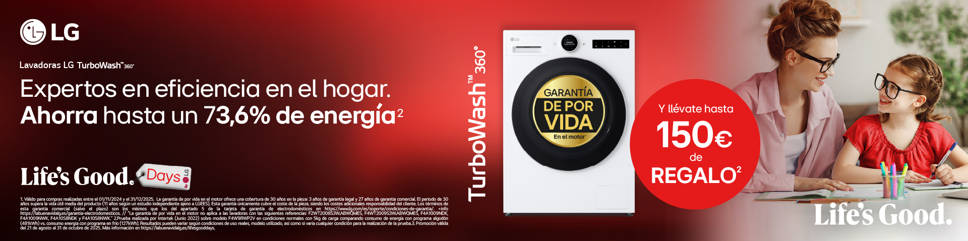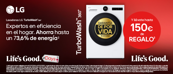 Del 21 de agosto al 31 de octubre compra una lavadora LG y llévate hasta 150 euros de reembolso. Canjea tu regalo en el siguiente enlace.