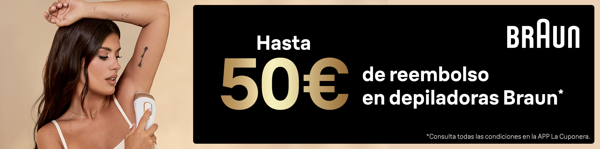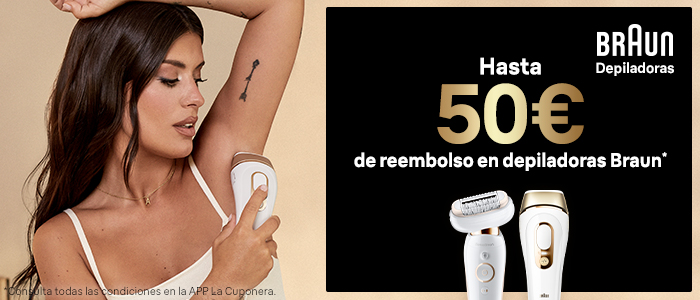 Consigue hasta 50€ de reembolso* por la compra de estas referencias seleccionadas de Depiladoras Braun IPL 5 y Silk-épil 9 Flex y hasta 30€ de reembolso* en IPL 3, IPL 1 y Silk-épil 9. Consulta las condiciones y registra tu compra en la App de La Cuponera para solicitar tu regalo. Más información en este enlace. Promoción vigente del 17/04/2023 a 31/08/2023.