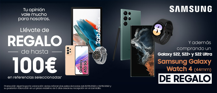 Promoción válida en territorio español del 02/03/23 al 23/03/23 (ambos inclusive), por la compra de un dispositivo Samsung Galaxy Z Flip4 o Z Fold4, Tab S8, Tab S8+, Tab S8 Ultra, Tab S7 FE, Tab S6 Lite, S22, S21 FE 5G, A53 5G o A33 5G (consultar modelos en Bases disponibles en este enlace, en las Tiendas Adheridas a la Promoción (consultar Bases). Regalo: un (1) Samsung Galaxy Watch5 40mm (SM-R900NZAAPHE) o Watch5 44mm (SM-R910NZAAPHE) o unos (1) Samsung Galaxy Buds2 (SM-R177NZKAPHE), en función del dispositivo comprado. Necesario registro en Samsung Account y en Samsung Members antes del 30 de abril de 2023, acompañando (i) imagen legible de la factura o albarán de entrega (ii) foto o captura de la pantalla del producto con el número IMEI o Número de Serie, y (iii) formulario de registro (consultar condiciones en Bases). Promoción únicamente aplicable a consumidores residentes en España, no acumulable y limitada a una participación por persona. Bases depositadas ante notario y disponibles en las Tiendas Adheridas a la Promoción, en la Página de la Promoción (https://www.samsung.com/es/offer/ecofest) y en la Aplicación. Organiza Samsung Electronics Iberia S.A., Sociedad Unipersonal.