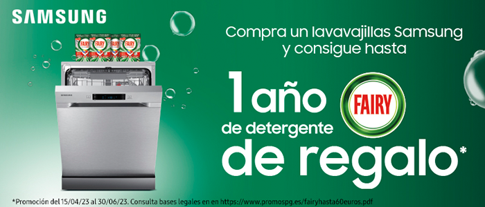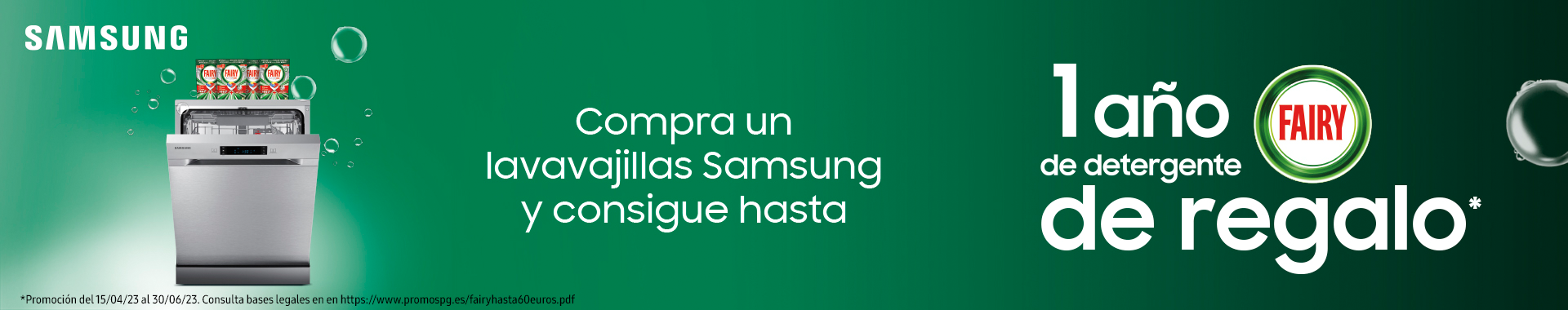 Compra un lavavajillas Samsung y consigue hasta 1 año de detergente Fairy de regalo.