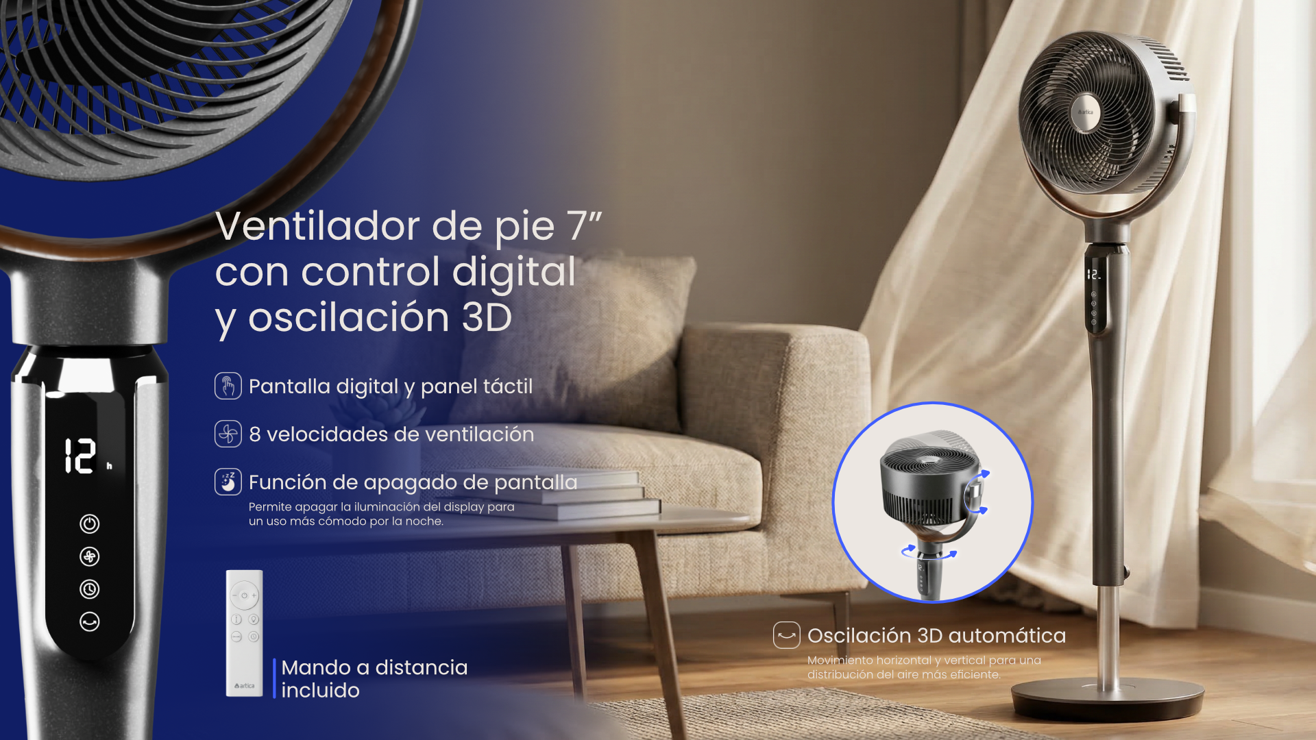 Dispone de 8 velocidades seleccionables, oscilación automática horizontal (60°) y vertical (90°) para mejorar la distribución del aire, y temporizador programable hasta 12 horas para un uso más cómodo durante el descanso o la noche.