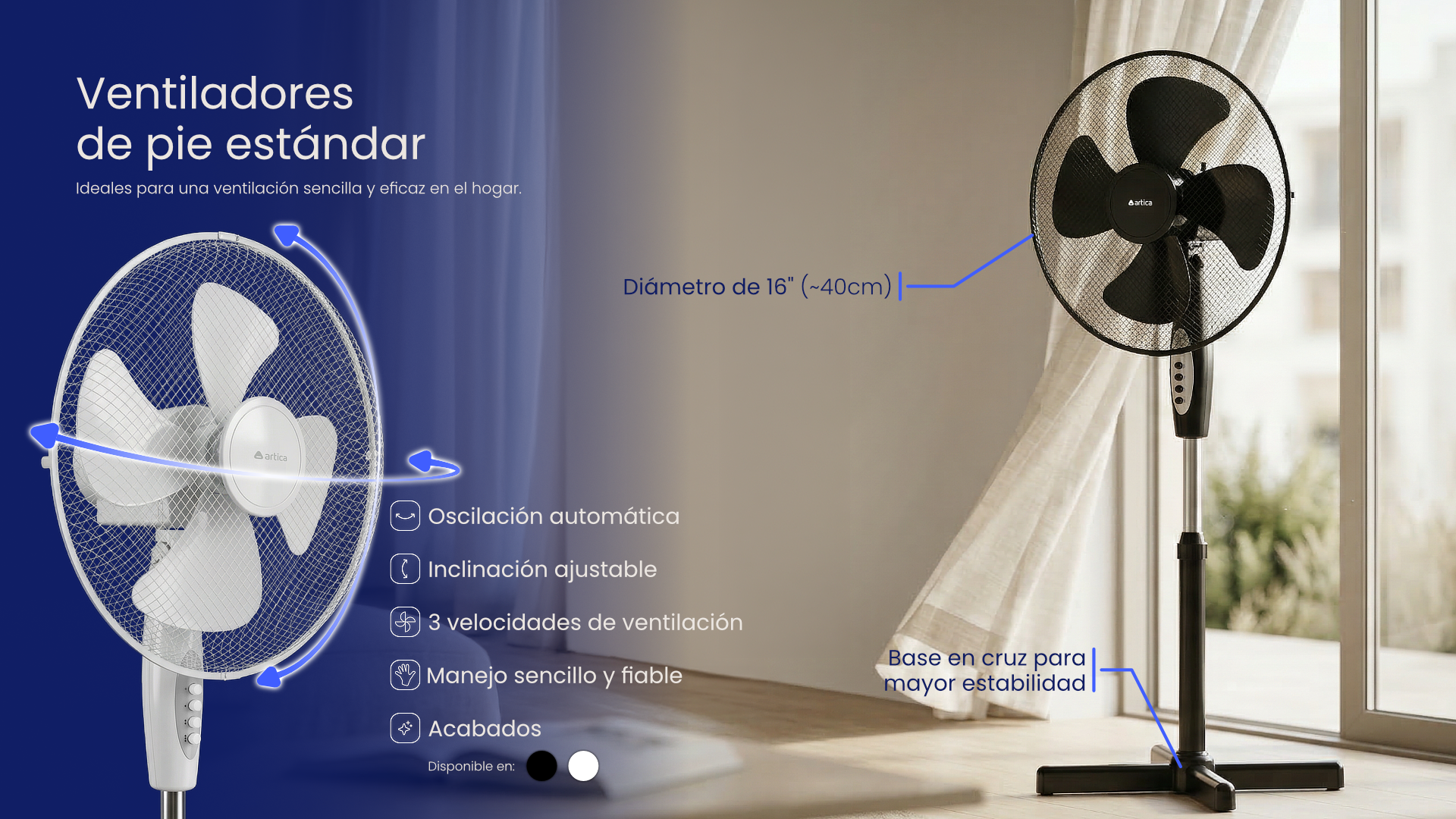 Su estructura estable y su diseño funcional permiten una distribución uniforme del aire en dormitorios, salones o zonas de trabajo. Incorpora rejilla protectora para mayor seguridad durante el uso diario.