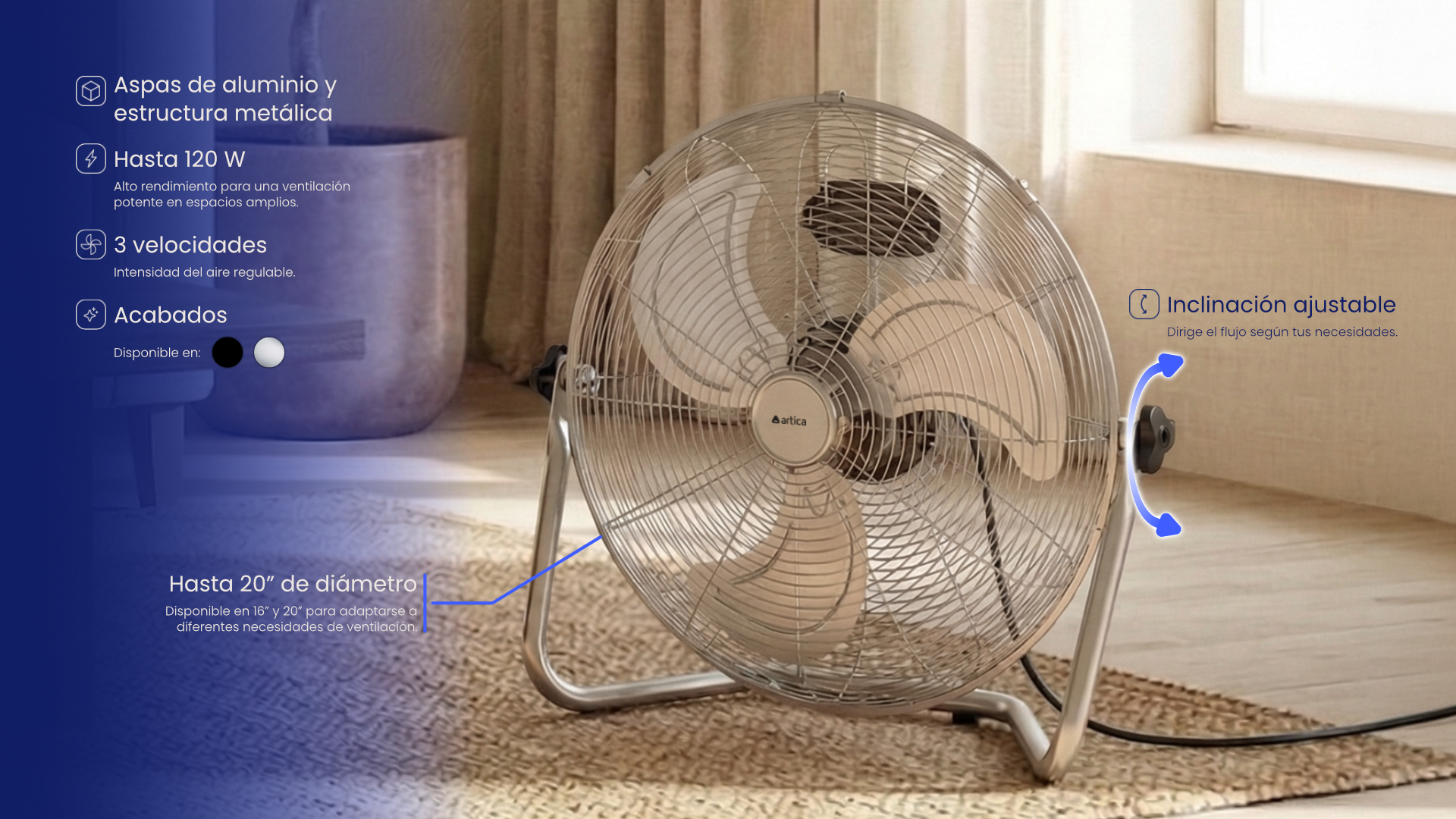 Gracias a su potencia de 120 W, permite mover grandes volúmenes de aire de forma eficiente, favoreciendo la circulación del aire en el ambiente.