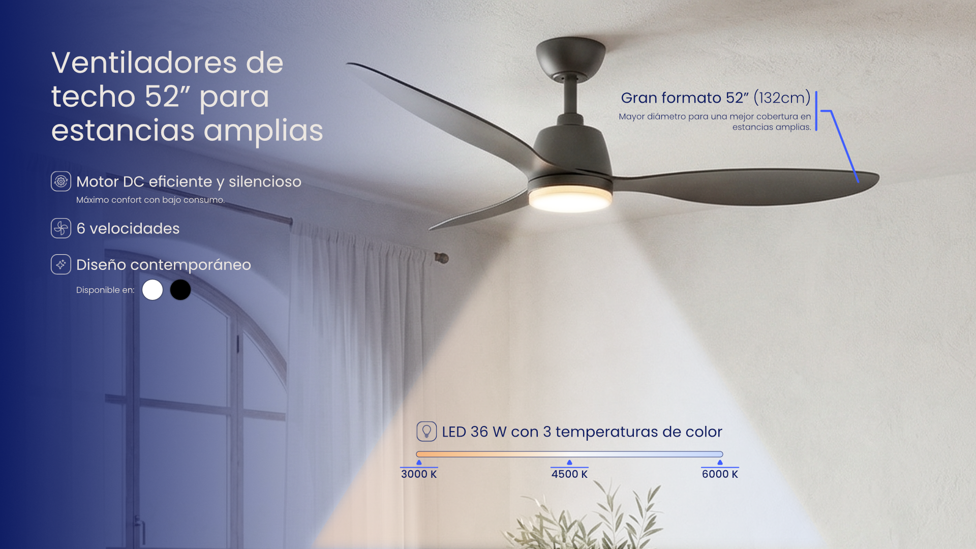 Dispone de 6 velocidades seleccionables mediante control remoto, permitiendo adaptar el flujo de aire según cada estancia. Su diámetro de 132 cm lo hace especialmente adecuado para salones, comedores y espacios amplios.