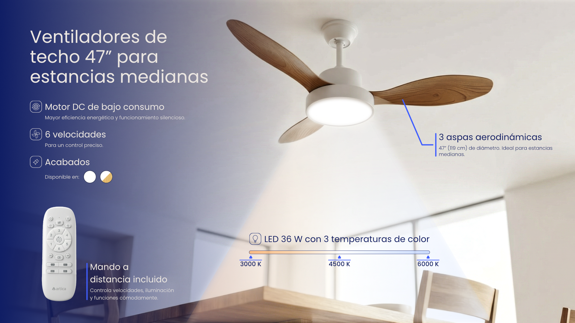 Dispone de 6 velocidades seleccionables mediante control remoto, permitiendo ajustar el flujo de aire según cada necesidad. Su diámetro de 119 cm lo hace adecuado para salones, dormitorios y estancias medianas o amplias.